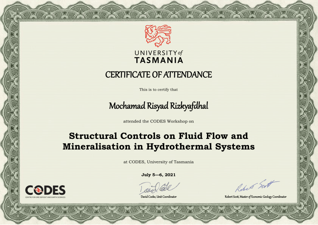 Pada Juli lalu saya berkesempatan untuk mengikuti salah satu workshop berjudul “Structural Controls on Fluid Flow and Mineralisation in Hydrothermal Systems” yang diselenggarakan oleh Centre for Ore Desposits and Earth Science (CODES), University of Tasmania. Untuk mengikuti workshop ini, peserta professional akan dikenakan biaya sebesar 825 AUD (Termasuk pajak) sedangkan peserta yang masih berstatus mahasiswa akan dikenakan 135 AUD (Termasuk pajak) dengan syarat melampirkan Letter of Statement (LoS) dari universitas asal.